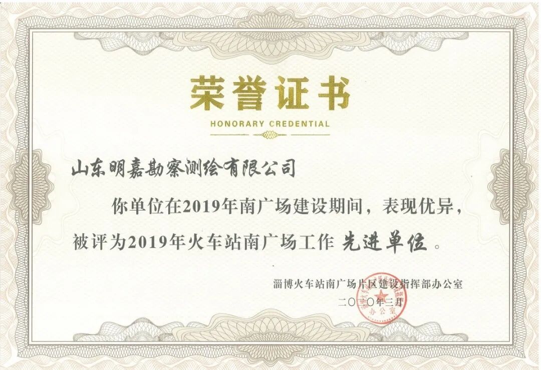 春暖花开,疫消寒退,明嘉公司在完成捐款、捐物、捐智慧的抗疫阶段性工作后,及时转入复工大战,统筹做好疫情防控和复工复产。公司上下坚决贯彻政府部署,采取积极的防控措施,在保障员工健康安全前提下,分类施策,灵活安排,高效有序,在严峻的疫情防控形势下,质量不放松,服务不打折,捷报频频传。 重点工程先进单位 近日在淄博市住建局视频会议室召开了火车站南广场疫情防控及复工复产工作会议,此次会议对南广场建设工作中表现优异、贡献较大的单位和个人进行表彰。明嘉公司荣获了“2019年火车站南广场工作先进单位”称号。 2019年,南广场各参建单位坚持以习近平新时代中国特色社会主义思想为指导,认真学习贯彻党的十九大和十九届三中、四中全会精神以及习近平总书记对山东工作的重要指示要求,根据市委、市政府决策部署,按照安全优质文明快速八字方针,担当作为,狠抓落实,奋战在施工现场一线,南广场建设工作取得突破性进展,实现了时间过半,任务完成过半的目标。 基础测绘优 秀单位 明嘉公司始终践行“客户优先、质量为本”的企业宗旨,“质量为本、科技创新、追求卓越、诚信服务”的质量方针,不断推动企业发展。疫情期间,公司全体员工上下一心,严防严控,严格遵守防控期间的各项管理规定,在防控疫情的同时,保质保量完成工作任务,我们也是“最美逆行者”中的一员,我们骄傲,我们自豪。 在今后的工作中明嘉公司将珍惜荣誉、再接再厉,不忘初心、牢记使命,更好地发挥示范带头作用,以崭新的精神风貌开创新未来。